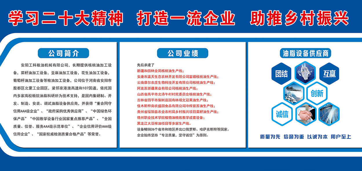 安陽(yáng)工科糧油機(jī)械有限公司,長(zhǎng)期提供核桃油加工設(shè)備,茶籽油加工設(shè)備,菜籽油加工設(shè)備,亞麻油加工設(shè)備,花生油加工設(shè)備,葡萄籽油加工設(shè)備等糧油加工設(shè)備,公司位于河南省安陽(yáng)市殷都區(qū)北蒙工業(yè)園區(qū),緊鄰京港澳高速和107國(guó)道,依托國(guó)內(nèi)多家高校糧院油脂科研所為技術(shù)支持,是國(guó)內(nèi)集研制、開(kāi)發(fā)、制造、安裝、調(diào)試油脂設(shè)備供應(yīng)商,并獲得“重合同守信用AAA級(jí)企業(yè)”、“政府采購(gòu)優(yōu)秀供應(yīng)商”、“中國(guó)綠色環(huán)保產(chǎn)品”“中國(guó)教學(xué)設(shè)備行業(yè)國(guó)家重點(diǎn)推薦產(chǎn)品”、“全國(guó)質(zhì)量、信譽(yù)、服務(wù)AAA級(jí)示范單位”、“企業(yè)信用評(píng)價(jià)AAA級(jí)信用企業(yè)”、“國(guó)家權(quán)威檢測(cè)質(zhì)量合格產(chǎn)品”等榮譽(yù)。先后承建了新疆和田林業(yè)...